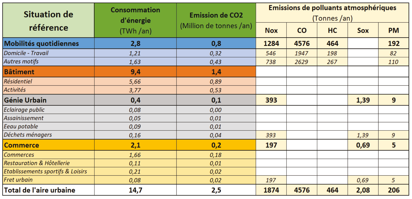 M-CLIMATE permet d'évaluer pour une situation de référence ou un scénario donné, les résultats sectoriels relatifs à la consommation d'énergie, les émissions de GES, et la pollution atmosphérique :